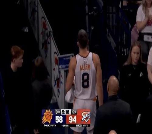 | 北京时间12月11日,NBA杯1/4决赛雷霆主场138-89狂胜太阳的比赛,在第三节比赛太阳首发主力阿伦发力推倒霍姆格伦引发场上冲突,被裁判吹罚一次二级恶意犯规直接驱逐离场。
