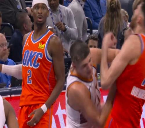 由于雷霆一边倒碾压吊打太阳,比赛早早就提前失去胜负悬念,也是让场上的太阳球员心态逐步失衡。在第三节比赛还剩5分18秒时,阿伦与霍姆格伦在场上对抗卡位时,阿伦突然发力一把将霍姆格伦给用力推倒在地。